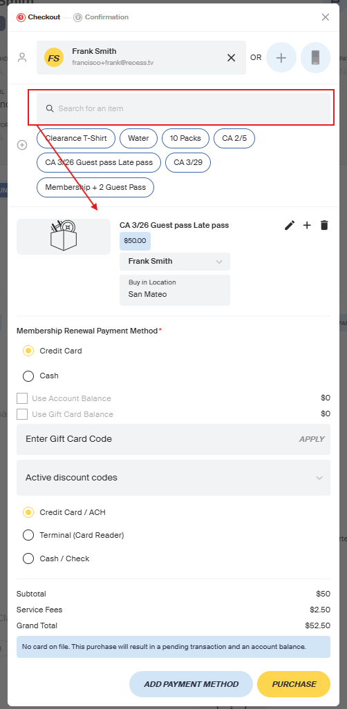 b. If the client has a card on file, it'll say "No card on file. This purchase will result in a pending transaction and an account balance." if they do not have a card. CLick on Add payment method if that is the case