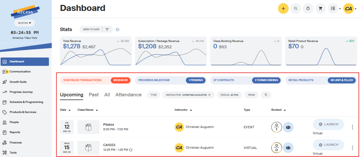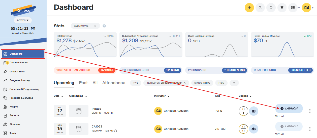 You are able to launch any Live or Private class directly from your Dashboard!* As an instructor, you can launch the class 30 minutes before class starts. Clients are able to join the class 15 minutes before the start of class.