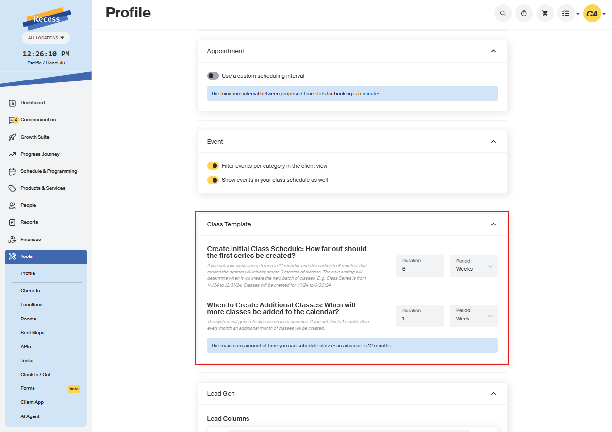 - Tip: This is useful if you plan a year’s worth of classes but want them added to your calendar quarterly. For instance, put 3 months in the initial schedule and 3 months in the next section, so new classes are launched every quarter.