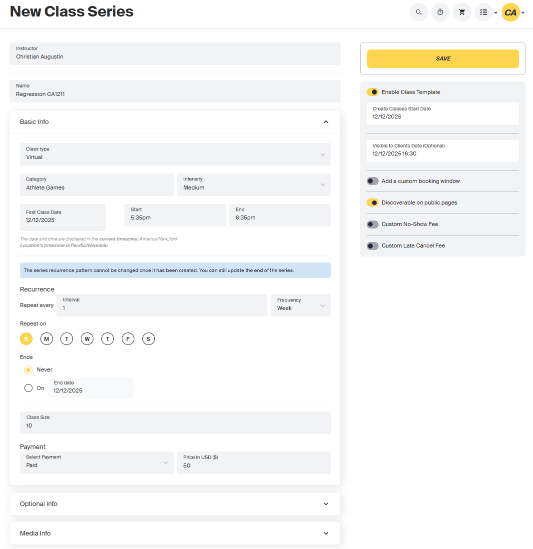 After creating a class template, the system will process it overnight. This means classes will appear on your schedule the following morning, not immediately.