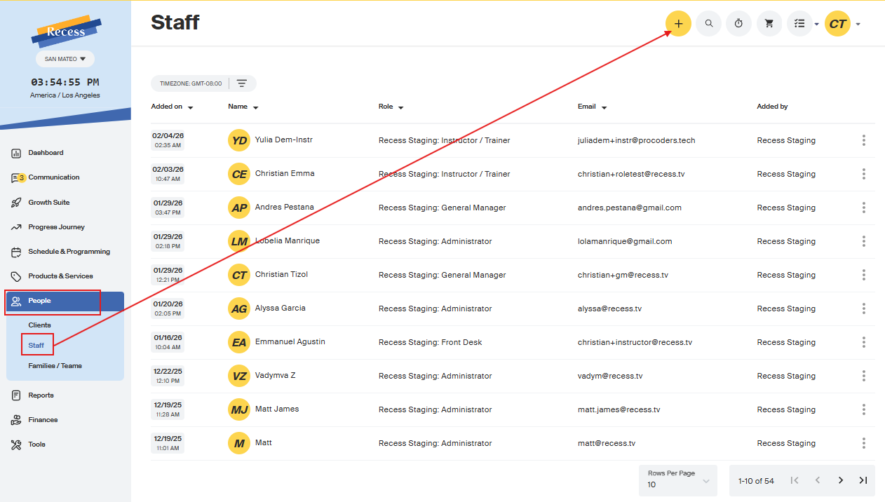 - Click on the Plus icon on the top right to Add Staff.