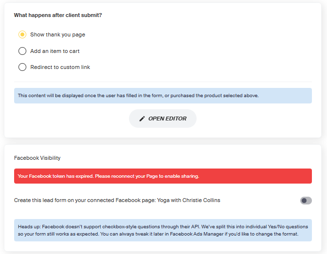 - At the bottom, choose what the lead will see after completing the form: