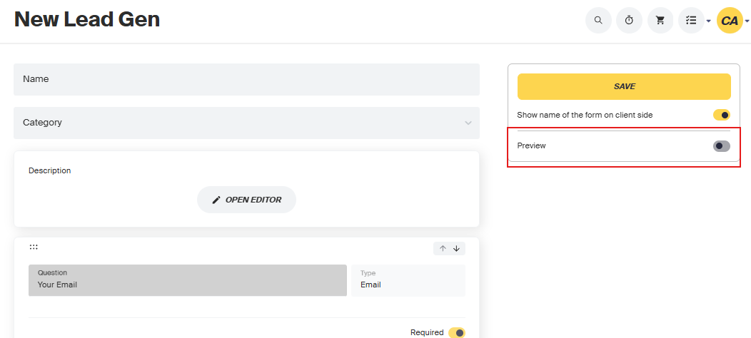 - To preview: Click the toggle at the top of the page while creating the form.
