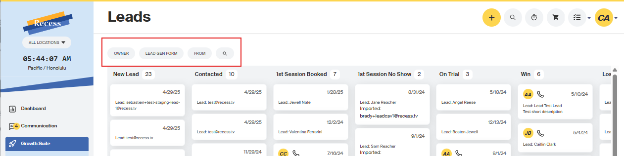 - Use filters to refine the page by owner, Lead Gen form, and from.