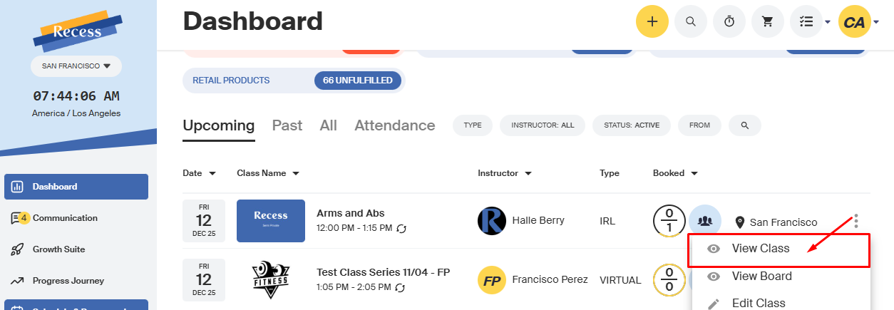 However, if you need to manually check a client in, please follow the directions below. To check a client into an In-Person class we must go to the class details. Go to the your dashboard and then "upcoming class", click of the class title or press the three dots to the right, and select View Class.