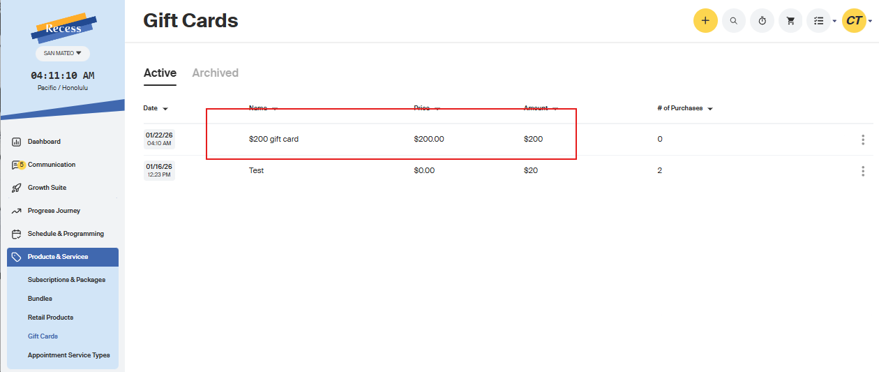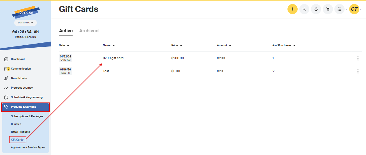 1. To set up your Gift Cards, hover over to the Products & Services tab > click Gift Cards: