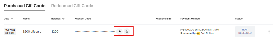 - To view and copy the gift card code:
