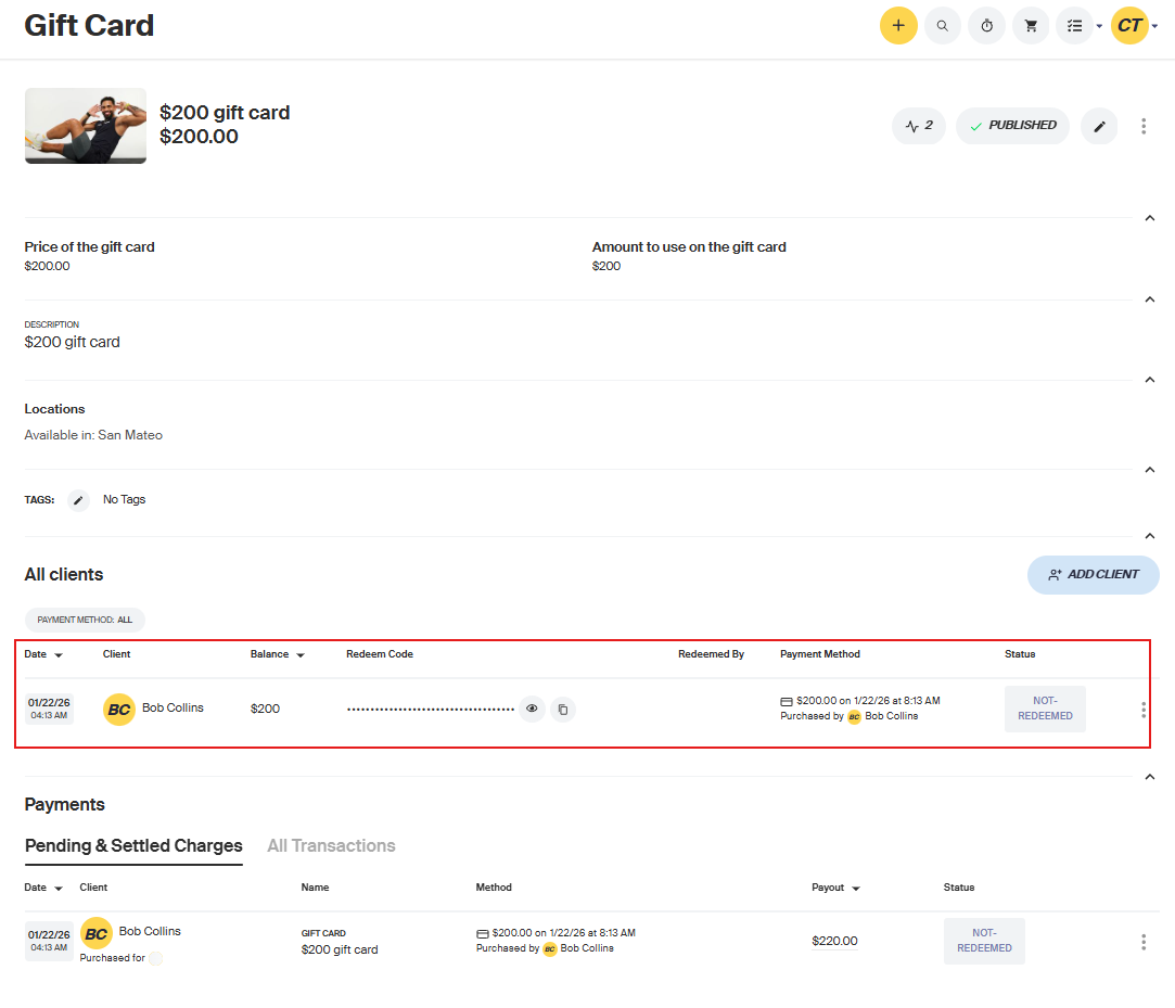 Gift cards will appear on your packages page. When a client purchases a gift card, they will be asked to enter the recipient's email. The recipient can then apply a gift card coce to the cart when checking out.