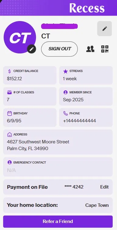 The Profile page in the Recess app is your personal hub. Here you can view your account details, track your activity, and manage your settings.