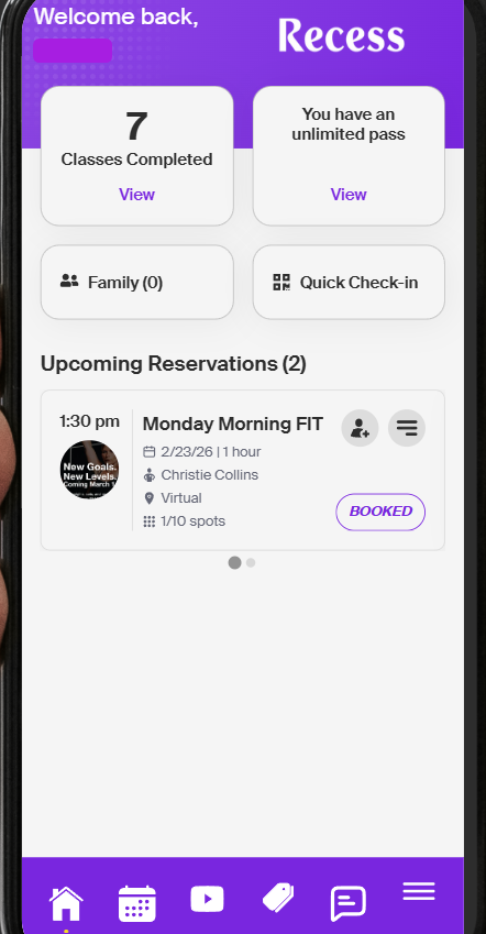 The Recess client app is customized by each studio, so the tabs and sections you see may look a little different depending on where you're a member. This article walks you through every possible tab that may appear in your app and what each one does.