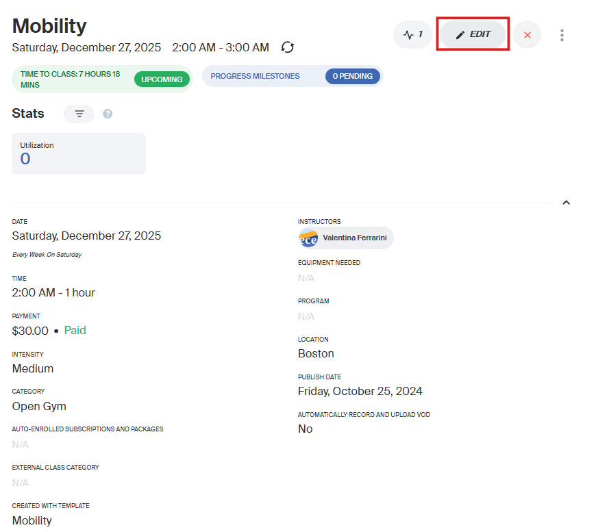 Find the class in the dashboard or navigate to the class’ details page. Click the 3 dots menu next to the class and click “Edit Class” or on the Edit icon on the top right of the class details page.