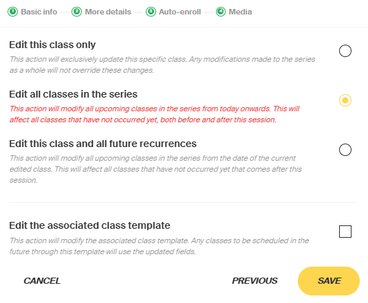 Note: When you edit a single class in a series, it removes the class from the series. Any modifications made to the series in the future will not override these changes.