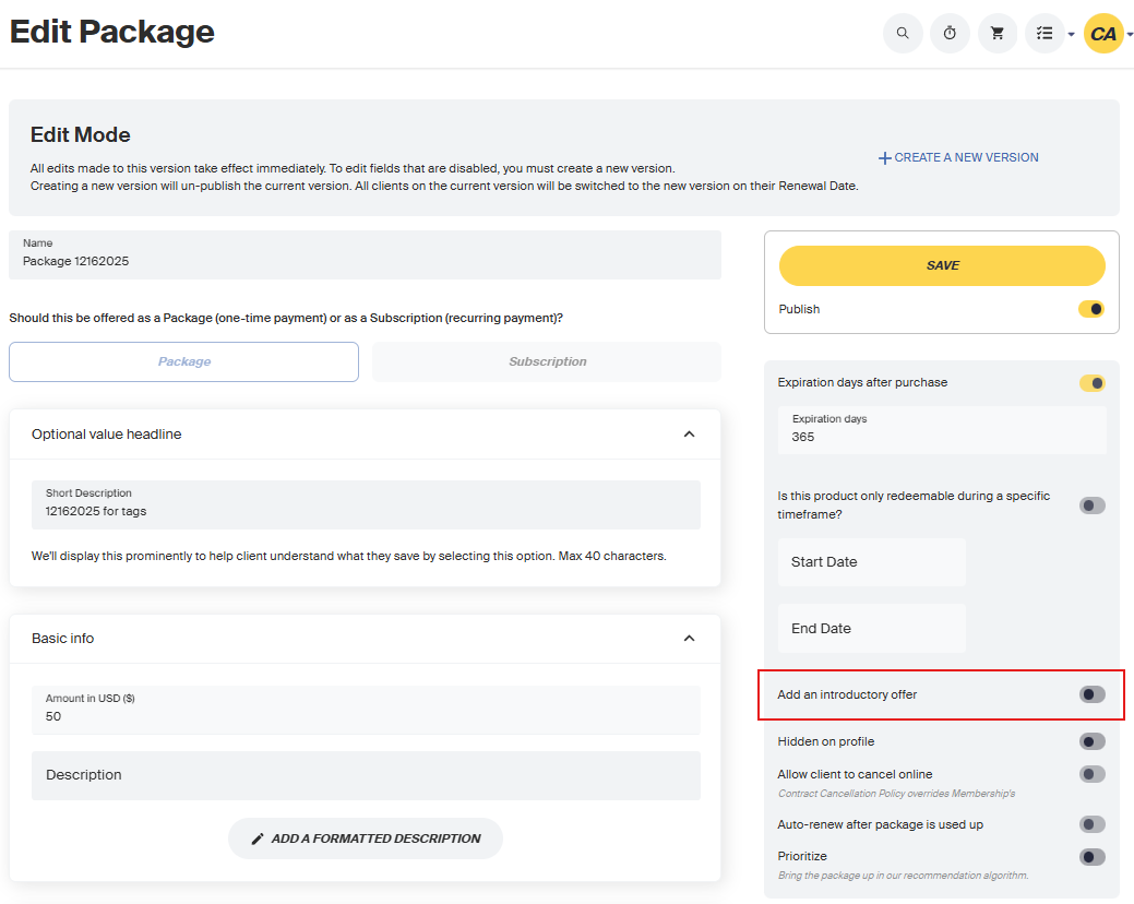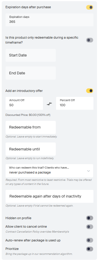 Free trials and introductory offers are a great way to get clients in the door and have them test out your classes before committing! You can add free trials and introductory offers to Packages or Subscriptions. You can customize the offer to any discount and length of time. After the trial period has ended, clients will renew at full price.