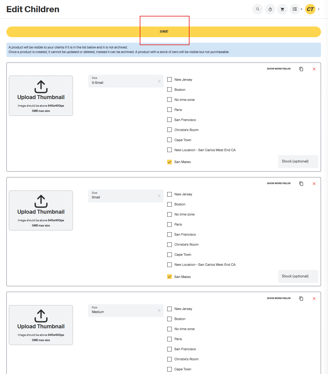 Note: You have the ability to archive any product combination you create. Archiving will make the product combination unavailable to purchase to your customers and to you inside of the Dashboard.