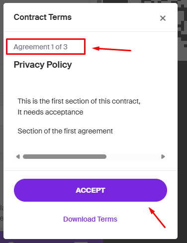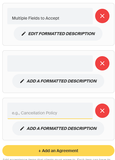 - If multiple agreements are included in the contract, that means the client will need to acknowledge different sections. Each item can have its own terms/content.